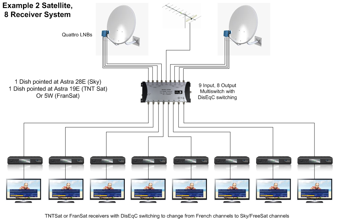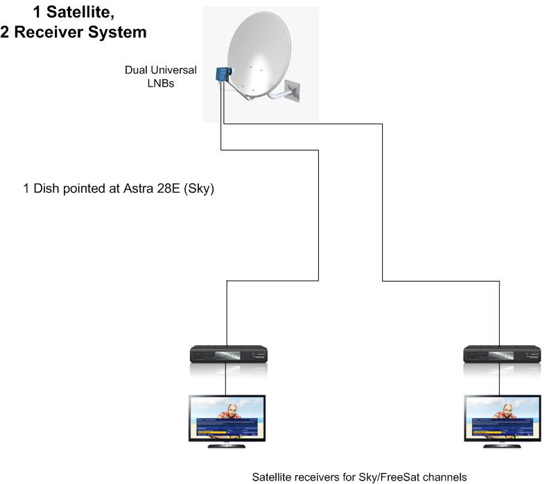 Please note that Sky and Sky+ boxes cannot be used in multi satellite systems as they do not support satellite feed switching. If you are using Sky subscription services a second receiver is needed for the alternative satellite(s). If just viewing free-to-air satellite channels on Astra 28E then a TNTSat or FranSat box may allow viewing of Freesat channels as well.